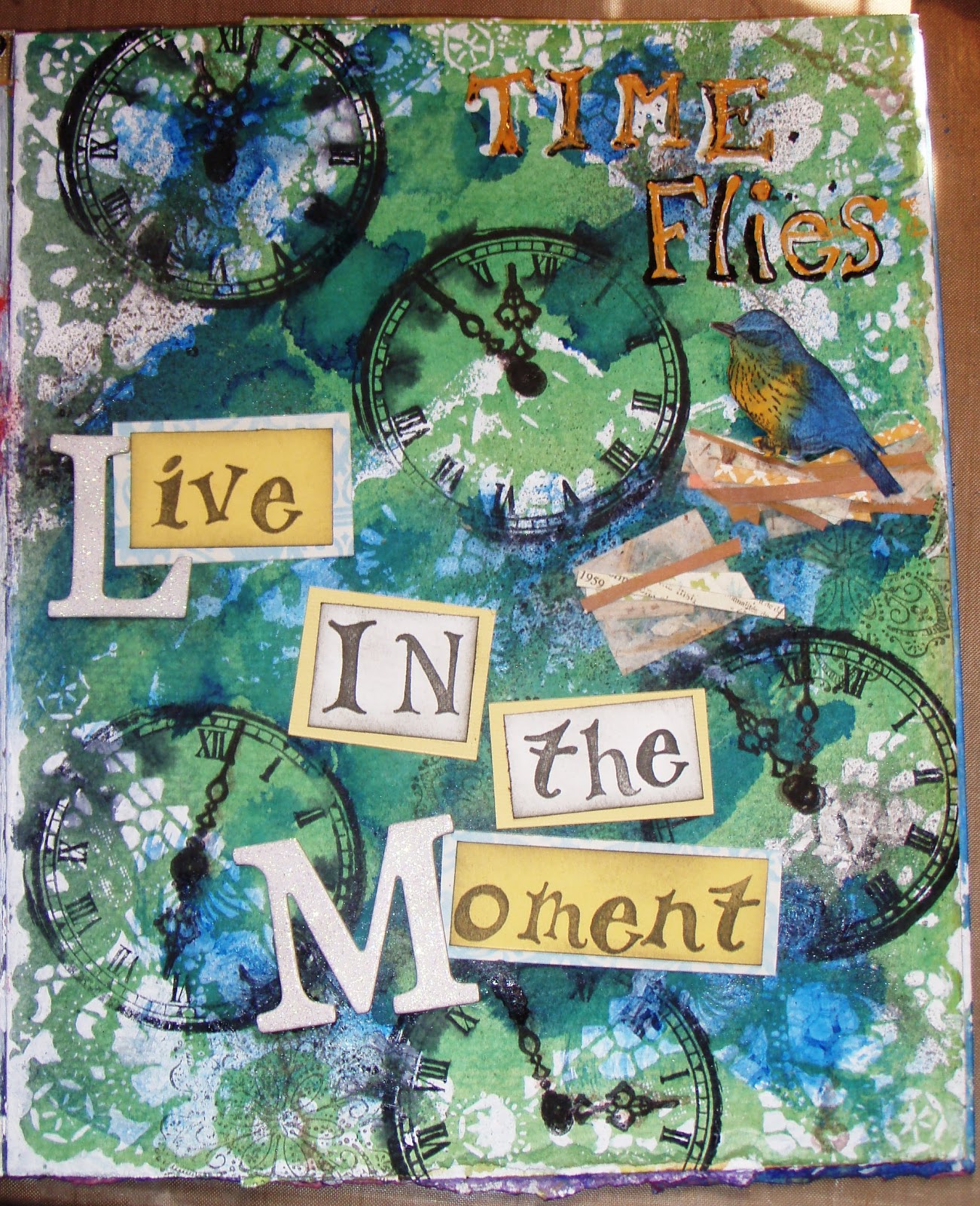Next I blended some alcohol ink on the page to add more color. The theme for the page was to use some symbols of time. I used my stamps with clock faces and clock hands.